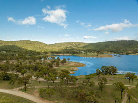 Drone aerial landscape of Eungella Dam with free campers on the waters edge. Queensland, Australia.