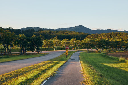 Long straight road at golden hour. Sunset hills background. Open highway travel concept. Scenic nature wallpaper.