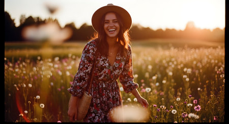 Beautiful young woman in hat and dress walking in field at sunset