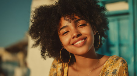 Young african female smiling outdoors in sunny urban setting.