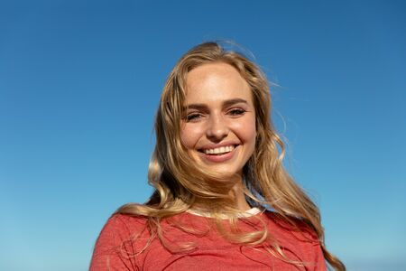 Portrait close up of a Caucasian woman with long blonde hair, smiling to camera. Weekend beach vacation, lifestyle and leisure.
