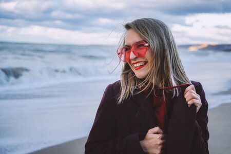 A young girl in bright pink glasses at the coast. Wind and waves in the winter sea. Emotional portrait