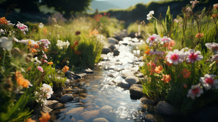 A stream gracefully cuts through a breathtaking hillside covered in lush green vegetation, A lush valley filled with wildflowers and a bubbling brook, AI Generated