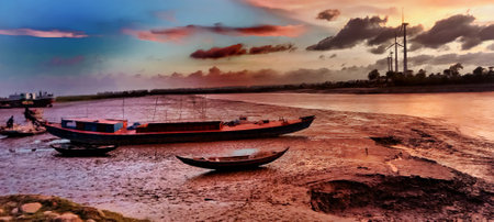Fishing boats on the bank of the river at sunrise, Sri Lanka