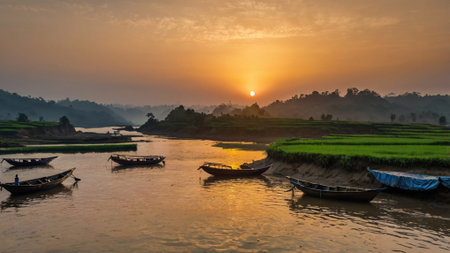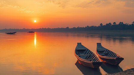 Serene view of the Mekong River at sunset with fishing boats in Laos. No people, copy space.