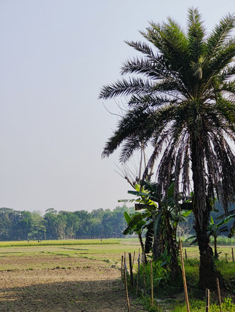 Green paddy fields and long rows of trees landscape in village side. Green paddy field view of Asian countryside. Paddy plantation.