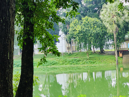 Peaceful countryside pond scene with lush green trees and a clear blue sky. Tranquil nature