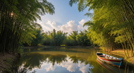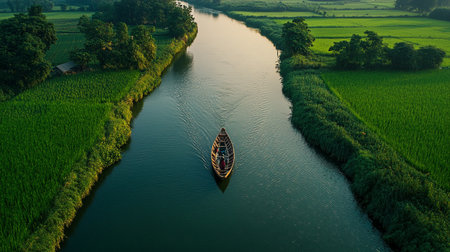 Enjoy a tranquil aerial view of a boat gently floating on calm waters, surrounded by lush greenery, illustrating the beauty of nature and peaceful escapes.