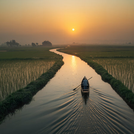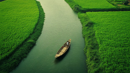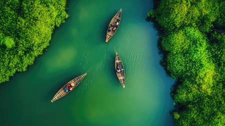 Aerial view of traditional wooden boats on a serene green waterway, surrounded by lush greenery. This peaceful scene captures the essence of nature and tranquility.