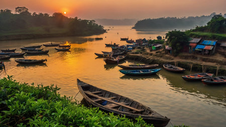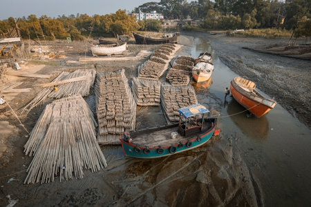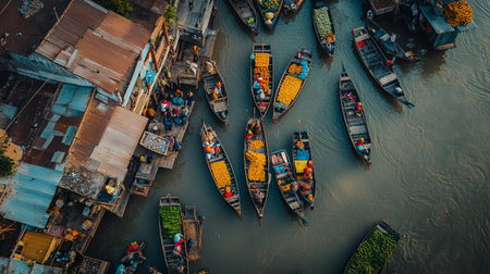 Generative AI : Aerial view of Hundreds of wooden boats fan out around their moorings in patterns which resemble flower in Buriganga river Dhaka Bangladesh