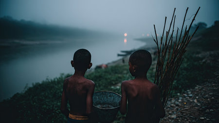 Bangladesh, Rangpur- August 21, 2021. two young boys are sitting wearing a blackout T-shirt and dark blue Panjabi. his short beard and his behind River blur a green nature background.