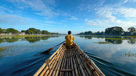A landscape involving a boat with a boatman running through a river with transparent water in a village surrounded by trees