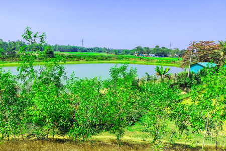 airview Landscape with green fields, scattered buildings, and dense foliage under hazy sky. Bangladesh, Rajshahi