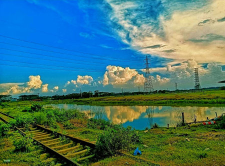 River water flows through in the cannel with greenery landscape view of under the blue sky