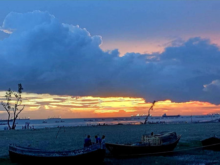 Sunset at the beach and fishing boats in the foreground, Sri Lanka
