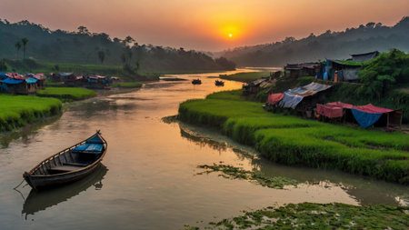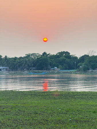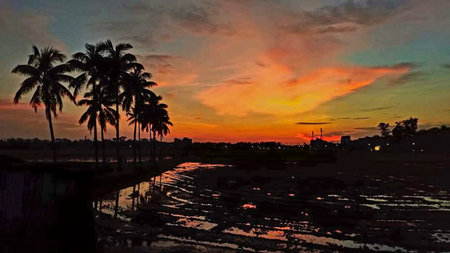 cityscape at dusk with buildings against an orange sky, reflecting urban growth and environmental contrast, embankment Rajshahi Bangladesh