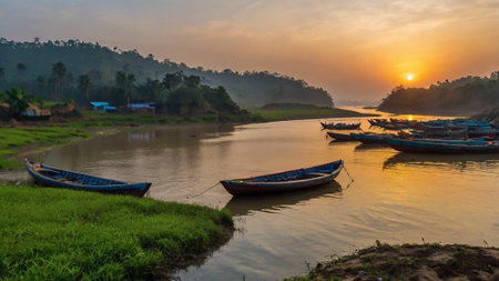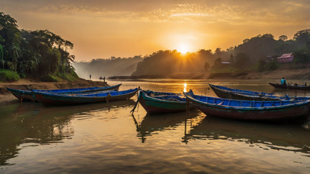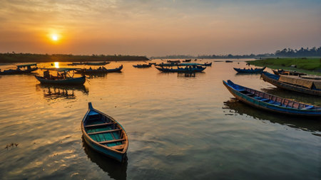 Rural Indian fishing boats tied at the shore of a river at sunset