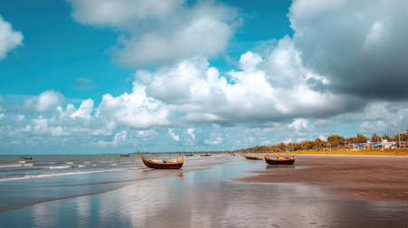 Fishing boats on the beach at low tide in Mui Ne, Vietnam