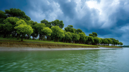 A tranquil riverbank scene showcasing lush green trees lining the water's edge under a dramatic, cloudy sky. The peaceful setting evokes a connection with nature.