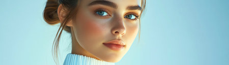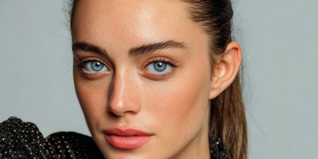 A high-resolution portrait highlighting clear skin, dark eyes, and well-groomed eyebrows. Subtle makeup and soft lighting emphasize symmetry and refined facial features. Ideal for skincare and editorial use.