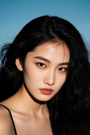 This striking portrait features a young woman with captivating eyes and long hair, posing elegantly against a dark background. The subtle lighting highlights her features beautifully.
