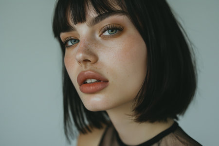 Close up of a young woman with a bob haircut and natural makeup against a neutral background