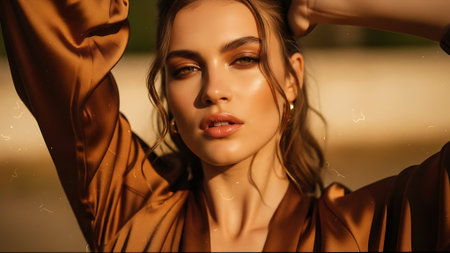 A woman stands outdoors during sunset showcasing her natural makeup. Her expression is confident and serene framed by soft light. She wears a light scarf complementing the warm colors of the sky.