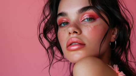 Close-up of young woman with pink makeup on pink backdrop.