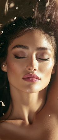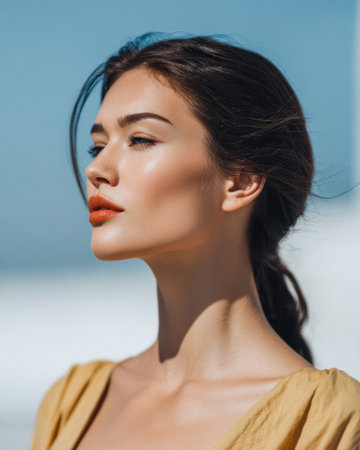 A woman with long dark hair is lying back with her eyes closed exuding tranquility and elegance. Soft sunlight highlights her facial features creating a peaceful ambiance.
