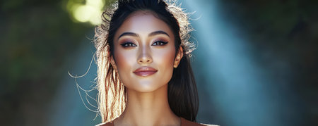 A woman stands outdoors illuminated by soft light breaking through the trees. Her long hair flows gently as she displays a calm and confident expression highlighting her natural beauty.