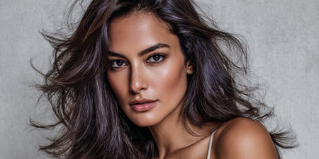 A woman with beautiful, long hair poses elegantly against a smooth, neutral background. Her confident gaze and natural beauty create an engaging and attractive portrait.