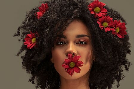 Young attractive afro woman with beautiful flowers in hair and lips. Beauty studio portrait.