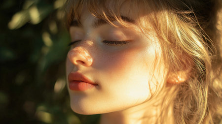 Captivating close-up portrait of a young woman with soft features and natural makeup, captured in warm sunlight, surrounded by lush greenery, conveying peace and beauty.