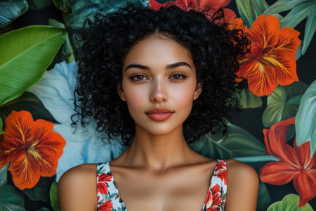 Brightly lit portrait of a woman with curly hair standing amidst colorful flowers in a tropical locale.
