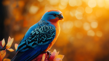 AI Generated. A Colorful Bird Perched on a Branch Surrounded by Autumn Leaves in a Forest