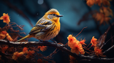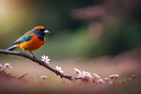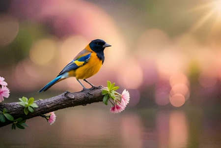 Vibrant Songbird Perched Among Cherry Blossoms, A Vivid Display of Spring and Natural Beauty. Colorful bird among cherry blossoms in spring bloom.