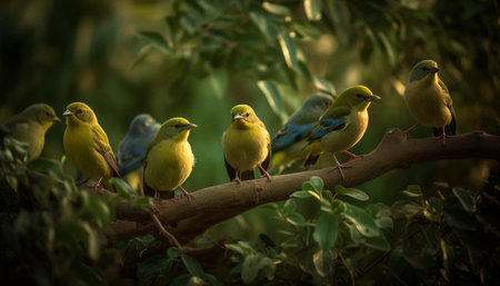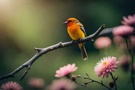 colorful bird perched on blooming flowers in garden, created with generative ai