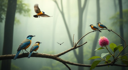 Beautiful birds on the branch in the misty forest. Colorful bird scene.