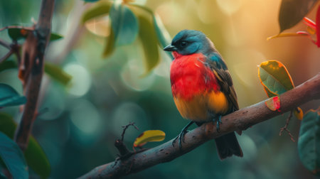 Vibrant bird perched on a branch with a soft, bokeh background.