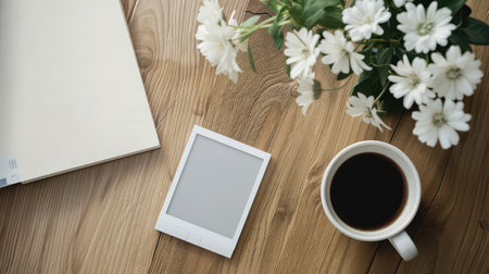 Top view of simple workspace with camera, notepad, dry flower and copy space on wooden table