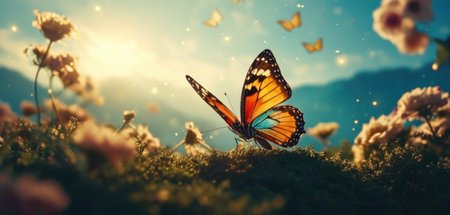 Beautiful butterfly on flower meadow at sunset. Nature background.