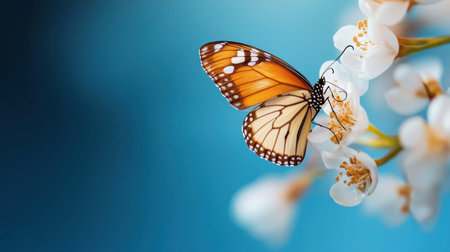 A Monarch butterfly delicately perched on white flowers, showcasing its intricate wing patterns, set against a serene blue background.