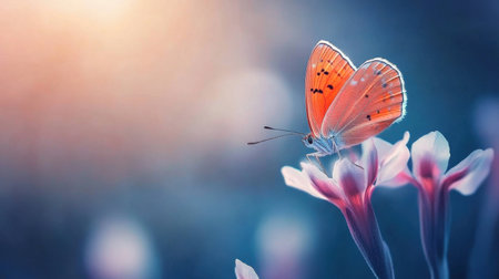 A delicate butterfly rests gently on wildflowers in a peaceful meadow. Soft light bathes the scene.