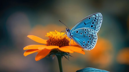 Beautiful blue butterfly sitting on an orange flower, captured in a side view, showcasing its intricate wings.