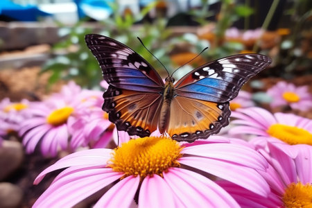 The butterfly, characterized by its intricate patterns and vibrant colors, rests delicately on colorful flowers in a lush garden filled with greenery under bright sunlight.