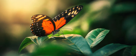 A stunning close-up of a vibrant butterfly resting on a green leaf. The bright orange and black wings contrast beautifully with the natural setting, capturing the essence of wildlife.