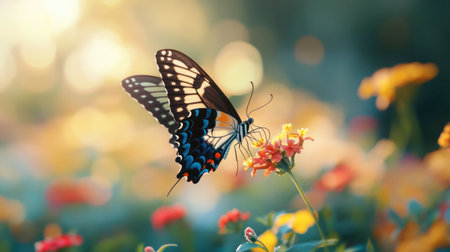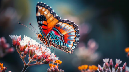 A colorful butterfly gracefully spreads its wings while resting on a vibrant flower in a serene garden. Natural light enhances the delicate textures and bright colors, creating a stunning display.