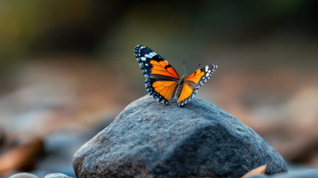 AI-generated This striking butterfly showcases its bold orange and black wing patterns while perched on a rough, textured rock.