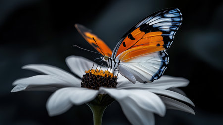 A stunning close-up photograph showcasing a vibrant butterfly with striking orange and black wings, beautifully resting on a natural surface.
