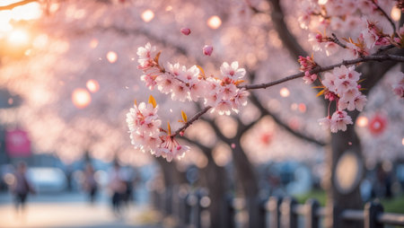 Cherry blossoms bloom along the river creating a romantic spring atmosphere at sunset